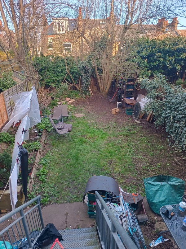 The garden is long and lush with a sunny balcony that catches the morning light. We’ve had more luck growing herbs than veg, but we love sitting out with tea, harvesting mint, or chatting as the bumblebees go by.