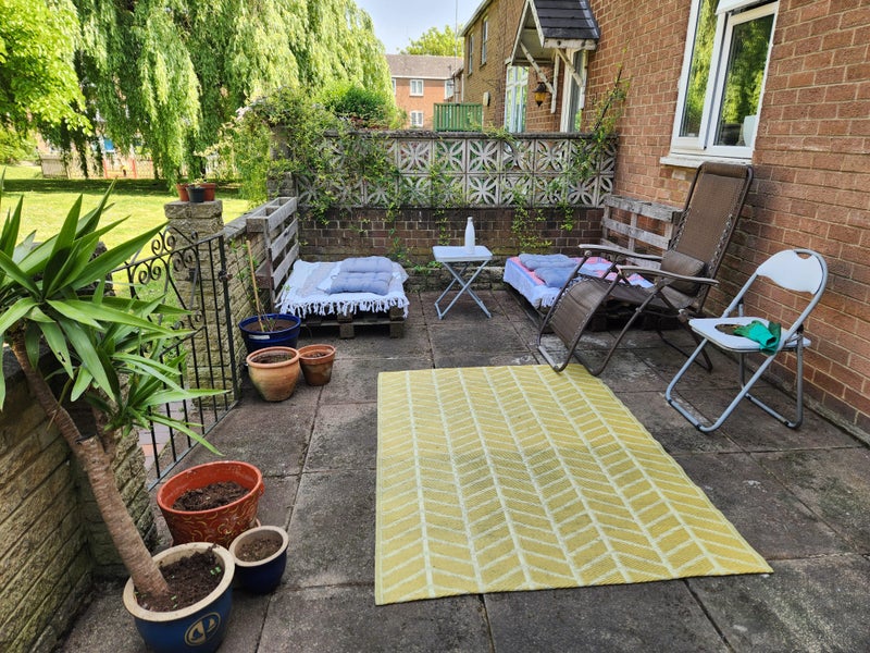 The house: We have a beautiful communal kitchen, a cozy living area, and a lovely garden/patio for enjoying the April sunshine.