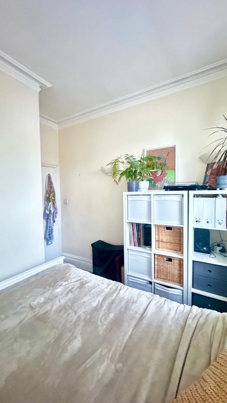 The bedroom offered is small but has a double bed, ikea shelving unit, workspace corner and a wardrobe.