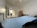 This room is very bright being on the second floor. It measures 13' (3. 96m) by 9'6" (2. 90m). It is furnished with a double bed with quality mattress, a double-door white wardrobe with mirrors, a five drawer chest, two wall shelves and a comfy armchair. There is a wooden laminated floor, double radiator and double glazed window with roller blind.