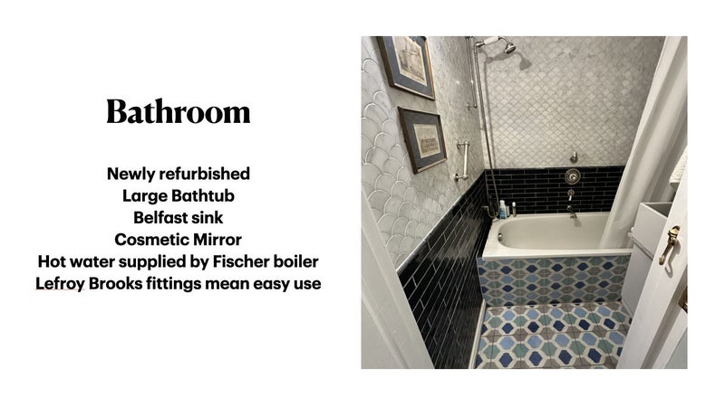 New, top quality appliances with Bosch washer-dryer, Miele air fryer oven and Hotpoint no frost fridge-freezer; energy efficient Fischer boiler; underfloor heating; bathtub; separate WC; open plan kitchen-dining room