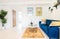 A large open plan kitchen/ living / dining area with lots of natural light. A large double bedroom with storage space.