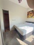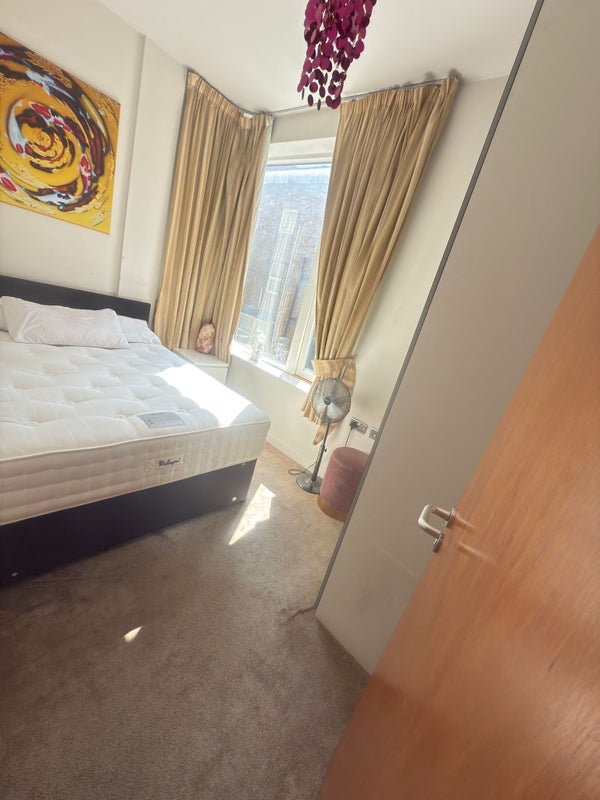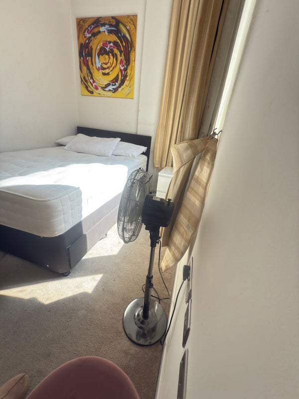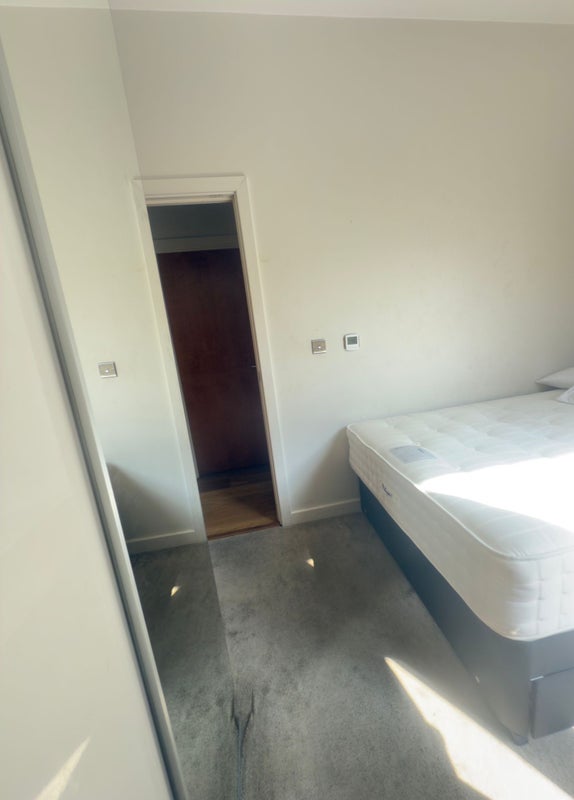The room available is bright with a corner window perspective. It measures 13' (3. 96m) by 8'5" (2. 56m). It is furnished with a double bed with quality mattress and under bed storage. A Tall double door wardrobe with mirror and draws. A bedside chest of draws. There is a bathroom immediately beside, with bath and excellent shower for your exclusive use (not shared).