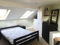 Located in the converted loft of a recently decorated house, the bedroom is light, airy, and fully furnished with a comfortable double bed, walk-in closet, double wardrobe, and chest of drawers. The private en suite includes a large shower, toilet, sink, and storage space.