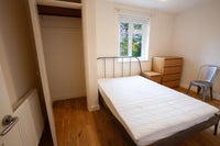 A bright room in a 3-bed flat, big enough for a double bed, a work desk, and storage. It comes furnished with a double bed + mattress, dresser, and a nightstand. There’s also a built-in cupboard.
