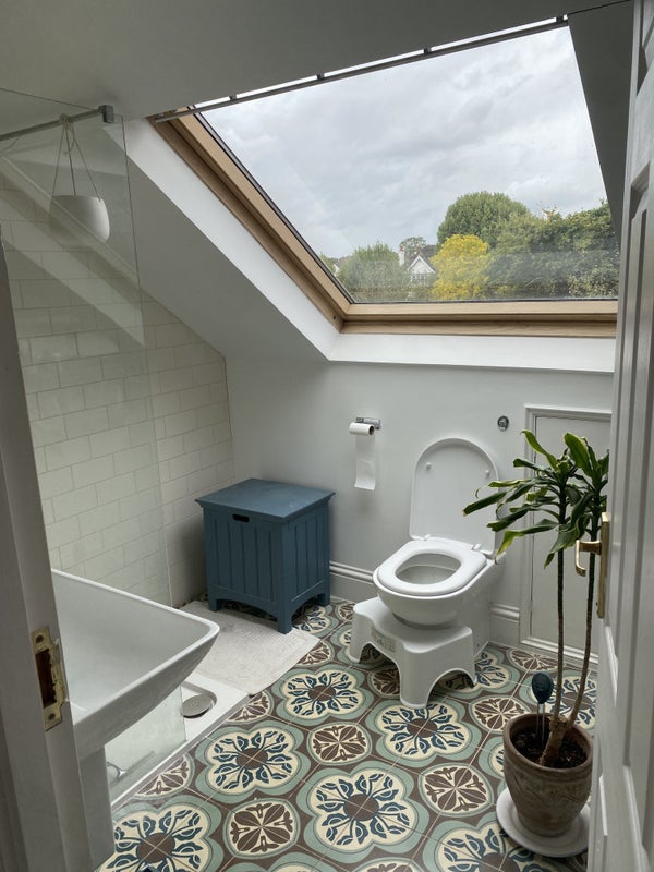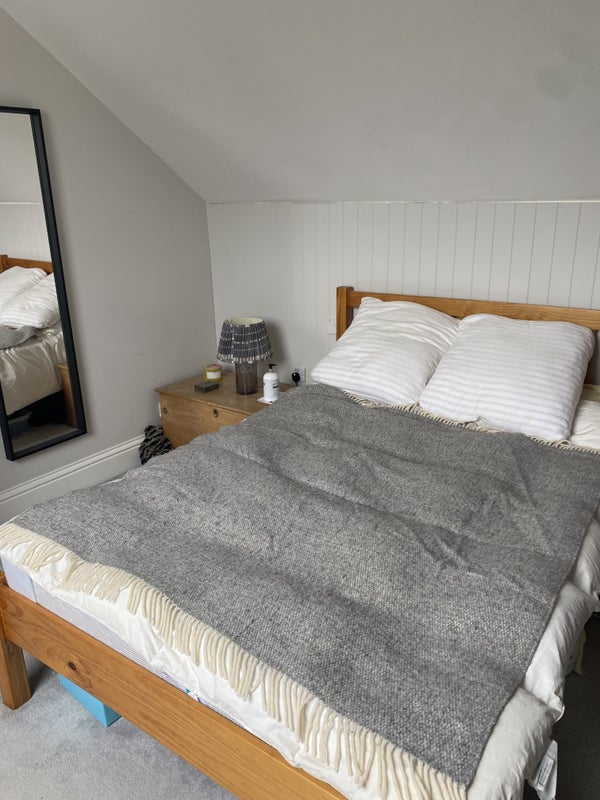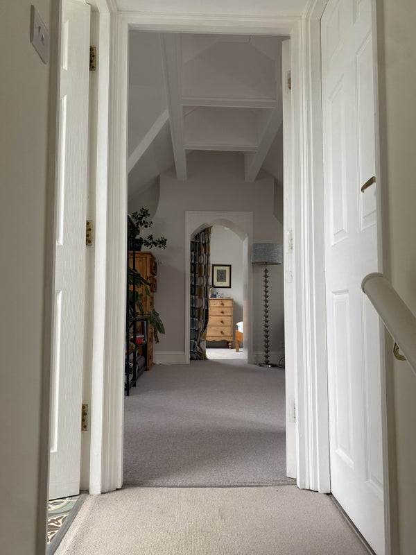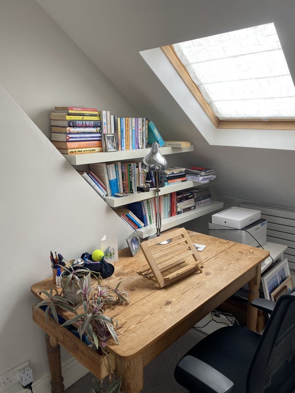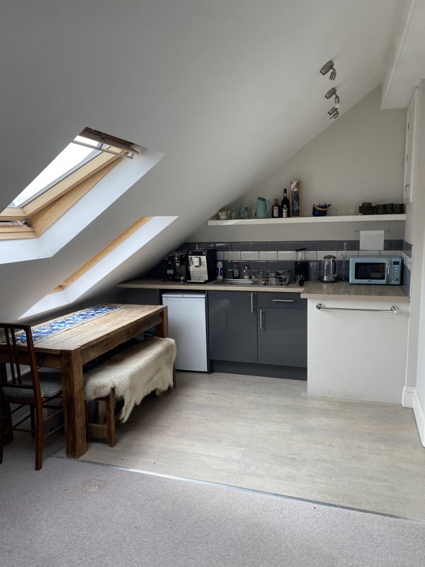 A double bedroom as part of the loft with its own bathroom, living area, workspace and kitchenette. There is access to the garden. This is part of a three-story house. There are two owners and a dog living in the house.