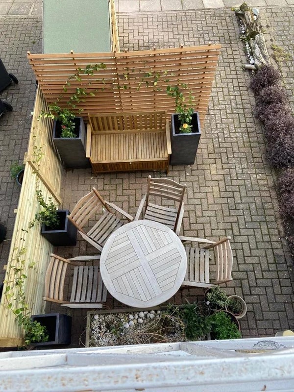 The property technically has three bedrooms, though one is currently used as a study or guest room, and two bathrooms, including one en suite. The other bedroom has an en suite so the upstairs bathroom is mostly used by the tenant of this room. There is free on-street parking, a private bike shed, and a small terrace with a large table and chairs at the front of the house.