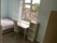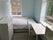 This room is fully furnished with a comfortable double bed, a wardrobe, a chest of drawers, a bedside table, a bookcase, a large mirror, a table and chair, a pair of black-out curtains.