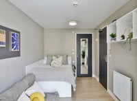 • Ensuite room (small double bed) in a 6-person shared student apartment block with a communal kitchen and social space.