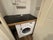 A contemporary fitted kitchen with integrated appliances, including a washing machine and fridge freezer