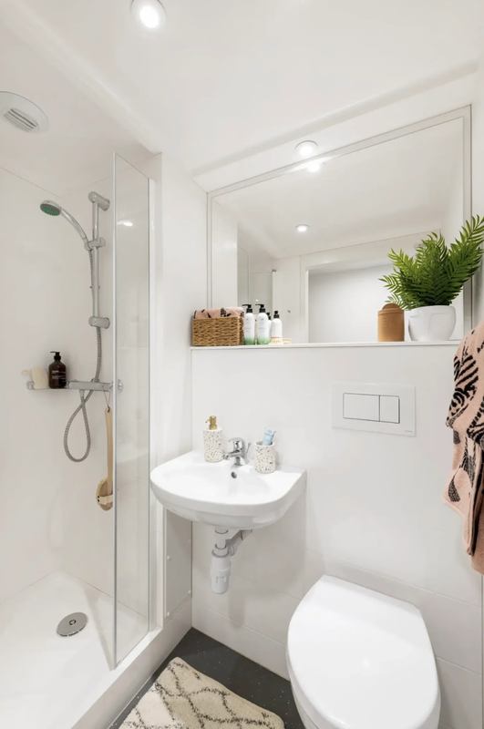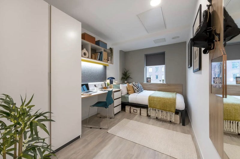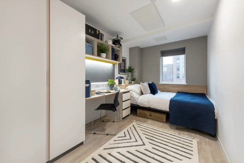 Experience great value in this Standard Ensuite room, measuring 12m², located in a shared flat designed for 7-8 students. These rooms are situated between the First and Tenth Floors. Each bedroom is furnished with a desk, chair, small double bed, Double Glazed Window, mirror, double wardrobe, and ensuite bathroom. The communal area is well-lit, featuring a large window and an additional 2 smaller windows that create a welcoming and spacious atmosphere. The kitchen is fully equipped with premium appliances, including a fridge, freezer, two multifunctional ovens, two induction hobs, and two microwaves, providing everything needed for a comfortable living experience.