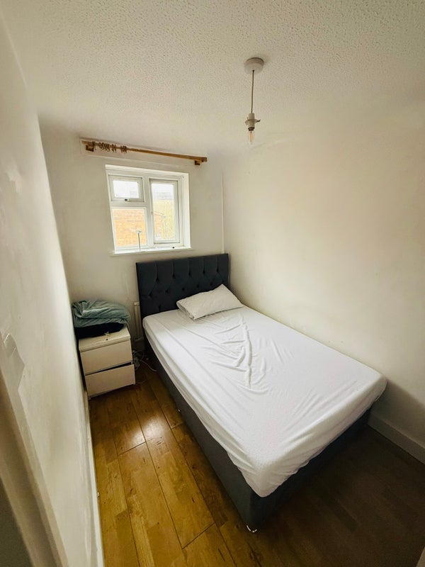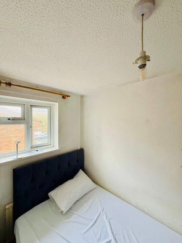 The bedroom comes fully furnished with a brand new double bed, bedside table, and wardrobe. New curtains will be supplied.
