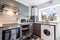 - Dedicated laundry space with drying racks and ironing board.