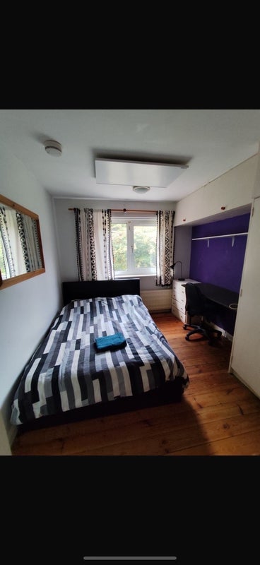 The room available is a spacious furnished double bedroom, including a double bed, desk, chair, and plenty of storage space.