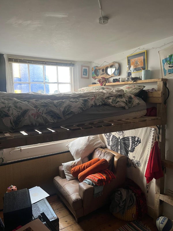 It’s a small double, as shown in the pictures it currently has a double bunk bed with a sofa underneath but can be fully emptied if preferred. Move in date is 14th March ideally