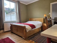 The bedroom has a small wardrobe, additional hooks behind the door, a floor to ceiling cupboard, two bedside tables, a table and chair. I am flexible on furniture and you may prefer to have your own bedding. There's a view from the window and afternoon/evening sun.