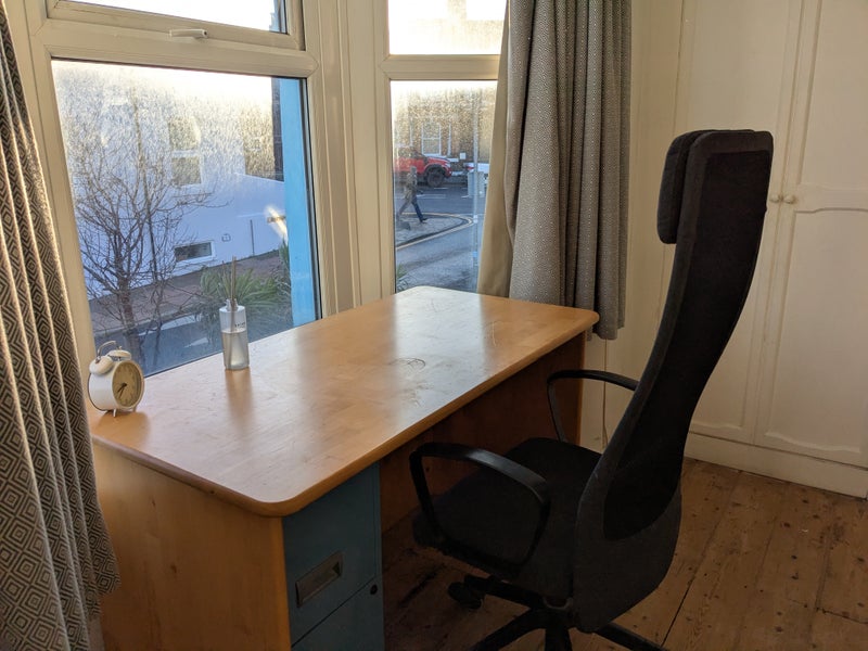 The room is fully furnished and has plenty of space for both relaxing and working from home.