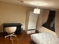 Has a desk, wardrobe, bed