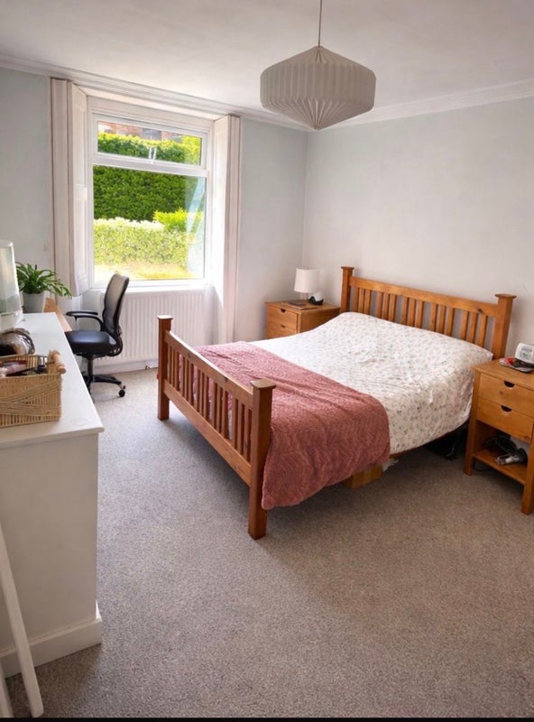 The en suite room has a comfortable king size bed, recent mattress, bedside tables, huge built in wardrobe, desk ,chest of drawers and computer chair.