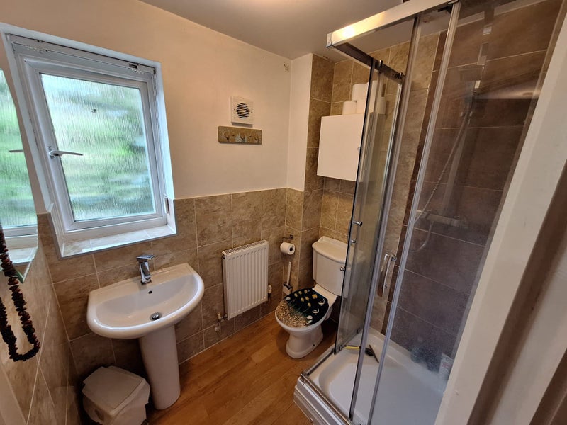 Medium-sized double ensuite with shower, comes with built-in clothes cupboard, wooden wardrobe, and clothes rail.