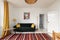 The bedroom comes furnished with a king size bed, wardrobe and chest of drawers.
