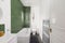 And the newly refurbished bathroom is decorated with emerald flute tiles surrounding the bath and shower.
