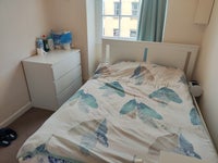 Spacious furnished room with bed, desk, and wardrobe available in a 6-bedroom student property. The house has 2 bathrooms (both with baths), a kitchen, 2 laundry machines, and shared common areas.