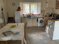 Large kitchen with open plan sitting room with sofa. Room for guests in the hall. Carpeted throughout. Has a gas cooker and boiler for the central heating, washing machine and dining table. Bathroom has integral shower, loo and sink. Curtained throughout for coziness.