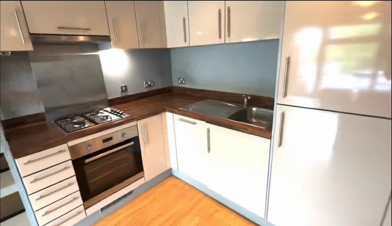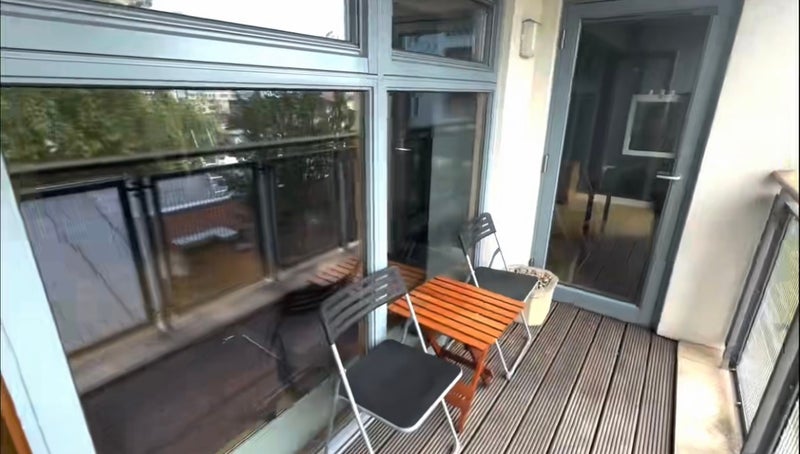 The apartment is fully furnished and ready to move in. It includes a double bed, wardrobe, desk and chair, and a private bathroom with shower. The open-plan kitchen is equipped with an oven, fridge, gas hob and a washer-dryer. The building has secure entry, good sound insulation, and convenient parcel collection downstairs.