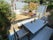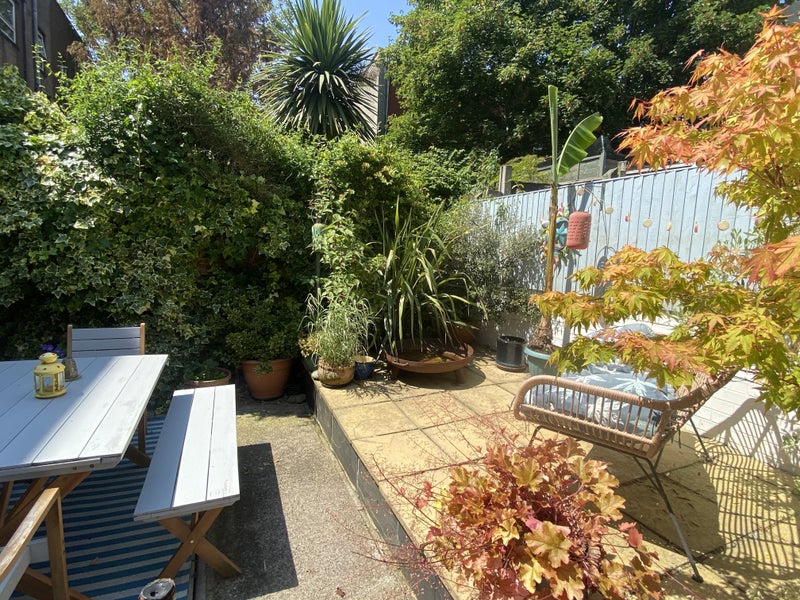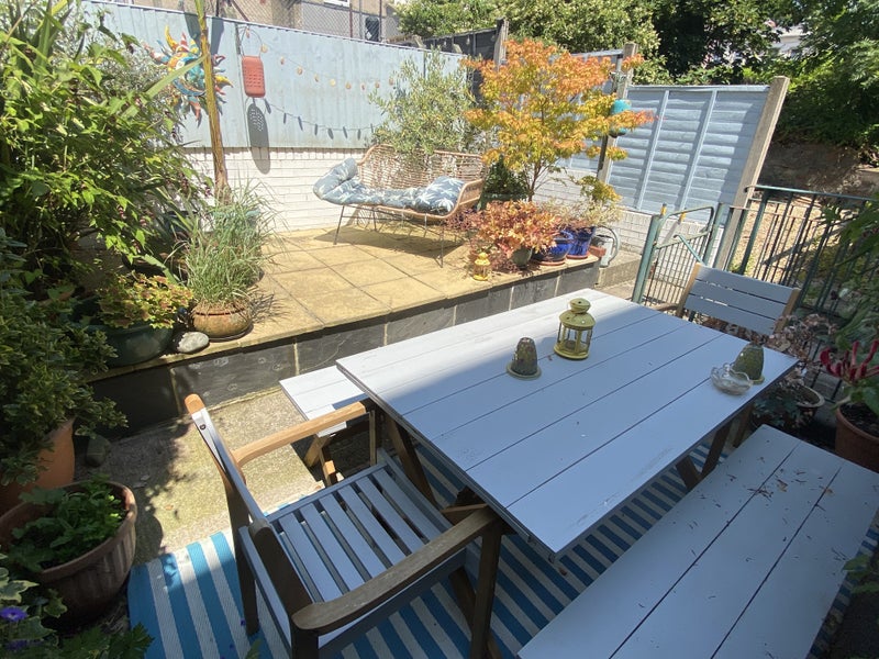 The property is a maisonette with two bedrooms on the ground floor and a large kitchen and living area upstairs. The kitchen is fully equipped with a dishwasher, fridge/freezer, large gas hob/oven, and washing machine, and opens onto a private terraced garden with table and chairs.