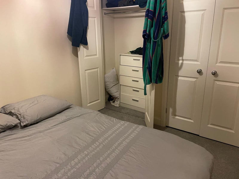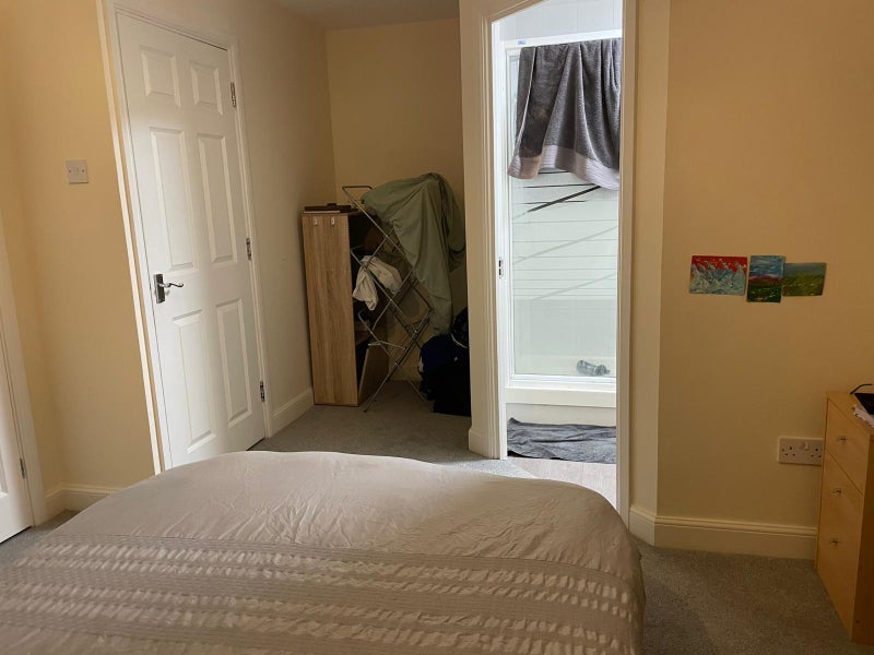 The room is a double ensuite bedroom with two large inbuilt wardrobes. It is the largest room in the house, which has 3 bedrooms. The house is an end of terrace townhouse with 3 storeys, with the bedroom on the top floor. We have a shared living room on the 1st floor complete with TV, plants, electric keyboard and pull-up bar. On the ground floor there is spacious shared kitchen with dishwasher, washing machine and dryer, as well as a study shared with one other person. There is also a downstairs toilet.