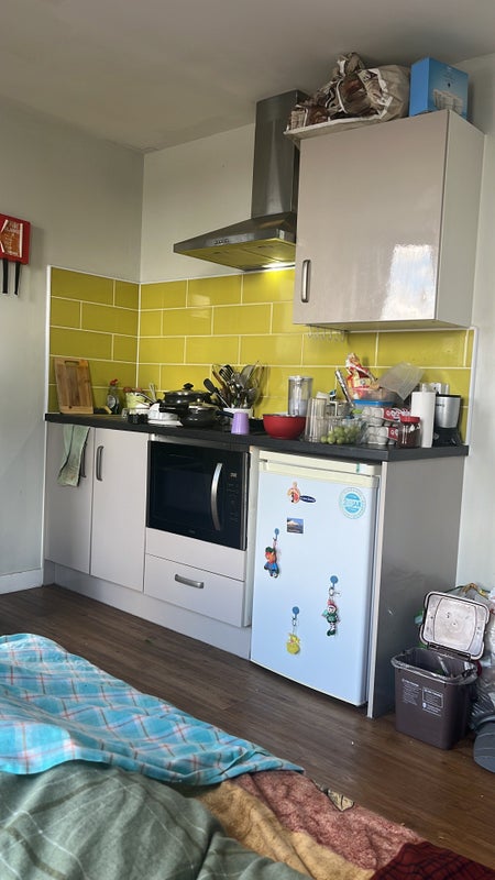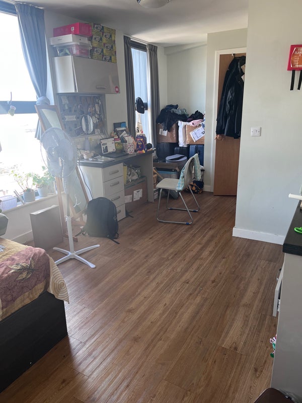 The studio is fully furnished and includes a fitted double bed, study desk, built-in storage, private kitchen with combi-oven, hob, and fridge, as well as an en-suite bathroom. There’s also plenty of space for additional furniture if needed.