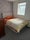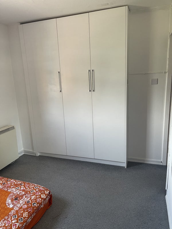 Room has a double bed and chest drawer and small wall cupboards.