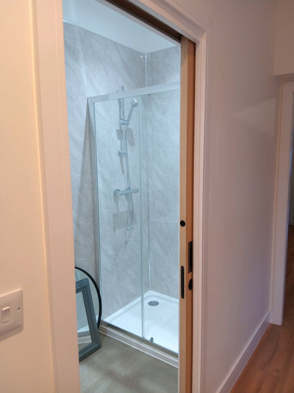 A stylish and modern off-suite shower room featuring a large shower and shower head, wash basin and toilet. Your shower room also comes with a heated, chrome towel rail.