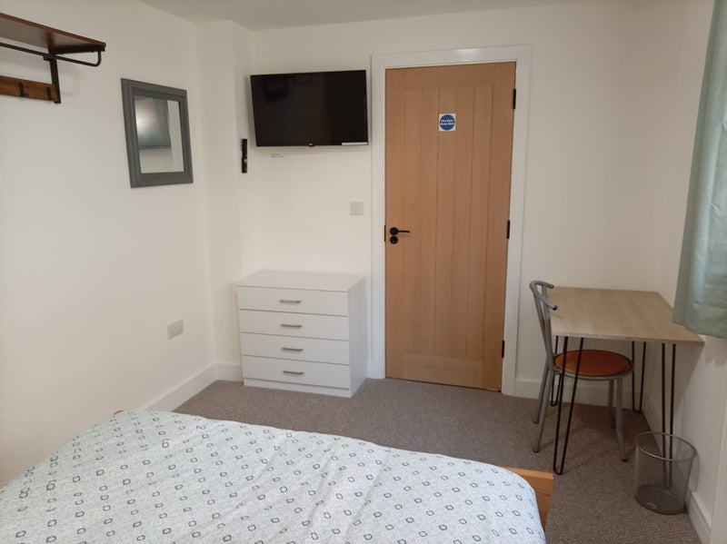 1 rooms currently available at the rear of the property. Your bedroom comes with brand-new contemporary furnishings, featuring a double bed, workspace with chair, chest of draws and wall mounted Smart TV.