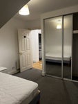 This is a top floor flat in central Dundee, on Union St, opposite the Overgate. There is an elevator as well as stairs. Flat has a shared bathroom and a separate kitchen and living room. Bedroom has a small cupboard and a large wardrobe for storage, a desk by the skylight window and a double bed.