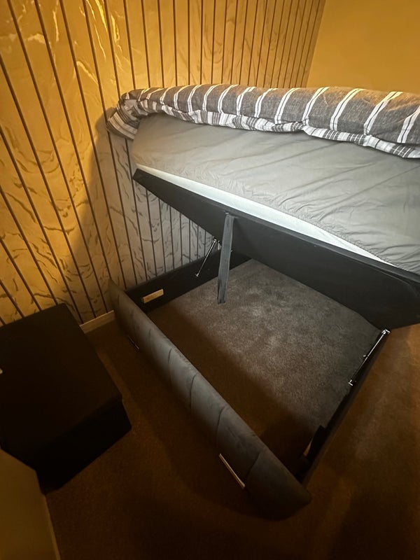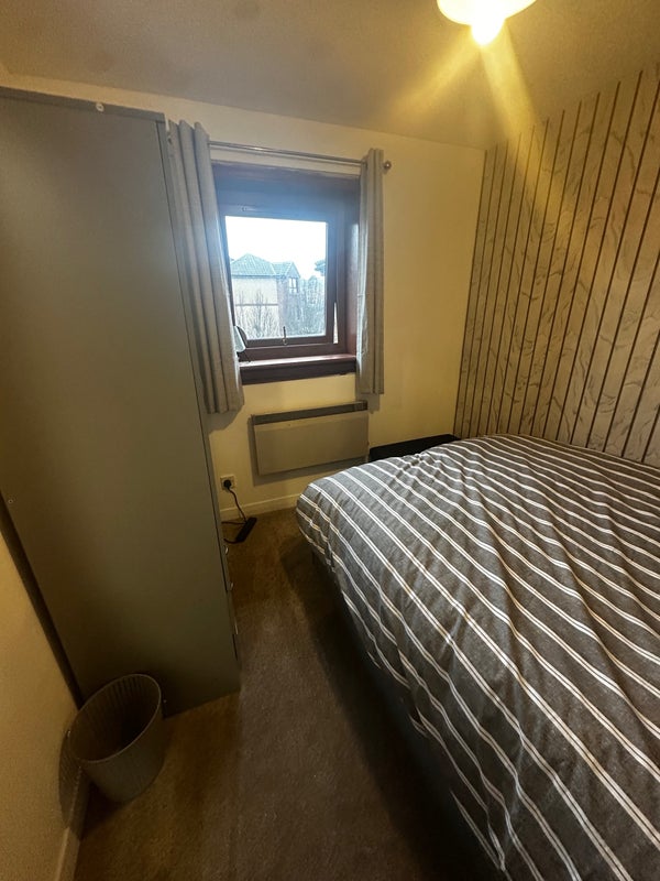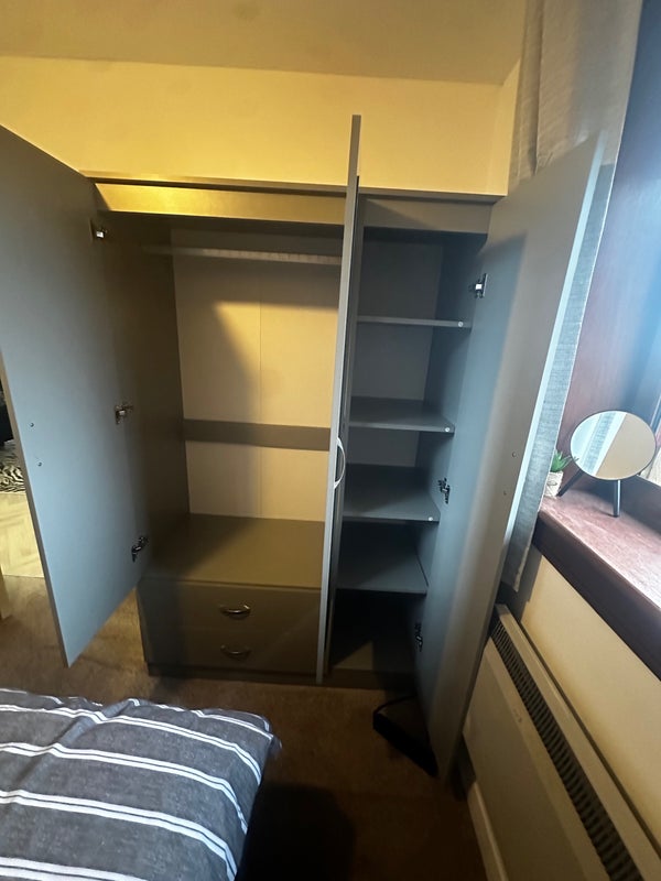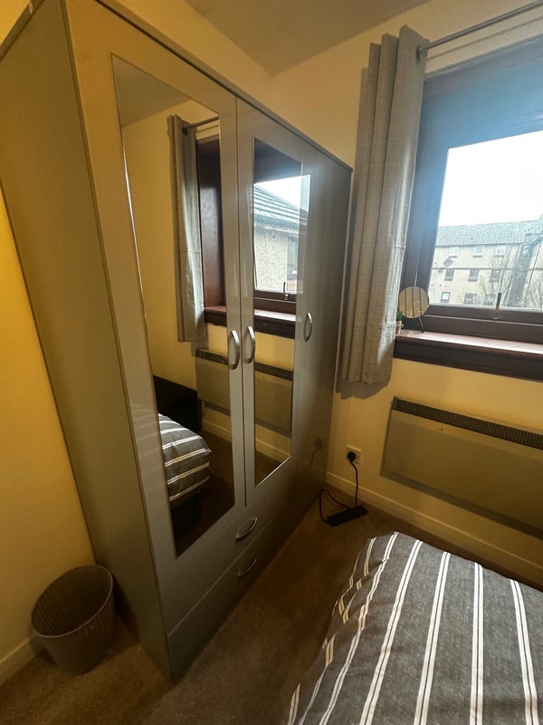Bright, tidy bedroom with storage bed and three-door wardrobe. Access to shared kitchen, living room, and bathroom. Living with a 27-year-old female professional.