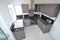 The modern kitchen includes an oven/hon, microwave, kettler, toaster, microwave, washing machine/dryer and fridge/freezer.