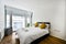 The room features floor-to-ceiling glass doors opening onto a private balcony, making it exceptionally bright and airy. It comes fully furnished with a comfortable bed, storage, and workspace, offering a calm, private space to relax or work from home.