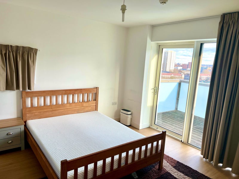 A bright, spacious king-size bedroom available in a modern, clean and peaceful flat in East Village, Stratford. The room benefits from large sliding doors leading to a balcony, bringing in lots of natural light and giving the space an airy, open feel.