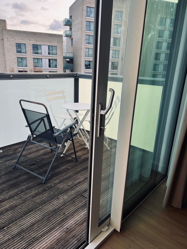 A bright, spacious king-size bedroom available in a modern, clean and peaceful flat in East Village, Stratford. The room benefits from large sliding doors leading to a balcony, bringing in lots of natural light and giving the space an airy, open feel.
