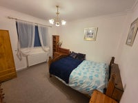 Advertised bedroom is located from the street side with carpets throughout, good size single & double glazed windows, new wallpaper, new light fittings and fully furnished: single & double beds, mattresses, duvets, pillows, wardrobes, desk/table, chairs, chest drawers, mirrors, lamps etc.