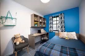 The room includes a double bed, desk, wardrobe, shelves, and sink with shared kitchen and bathrooms.