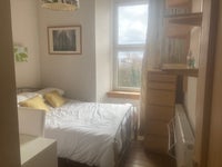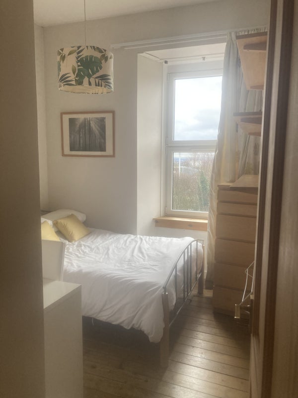 🛌 The room has a double bed, chest of drawers, 3 door wardrobe a desk and shelves for storage.