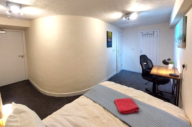 The room is very warm and cosy and has a delightful quirky L-shape and a a curved wall. As well as the ensuite, there's a walk- in cupboard with hanging rail and shelving.