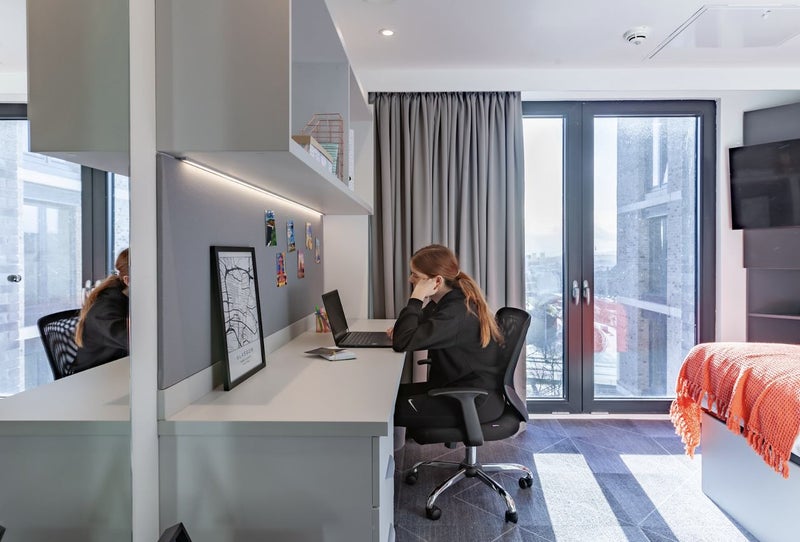 Our location, nestled between the University of Glasgow, Glasgow Caledonian University, and the University of Strathclyde, makes us the top choice for students from these institutions. Our accommodations come packed with features to enhance your university experience: enjoy an ensuite bedroom with a double bed and true mattress, plus a full-length mirror. Stay connected with unlimited high-speed Wi-Fi (up to 100Mbps wired) and catch your favorite shows on a smart TV in your room.