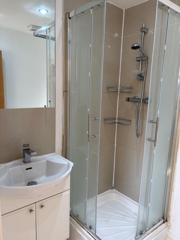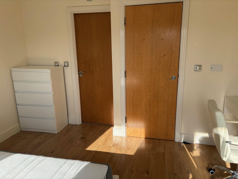 - Lage double with en suite shower. Copious built in storage, as well as bedside table, chest of drawers, desk and bed. Two large south facing windows.