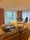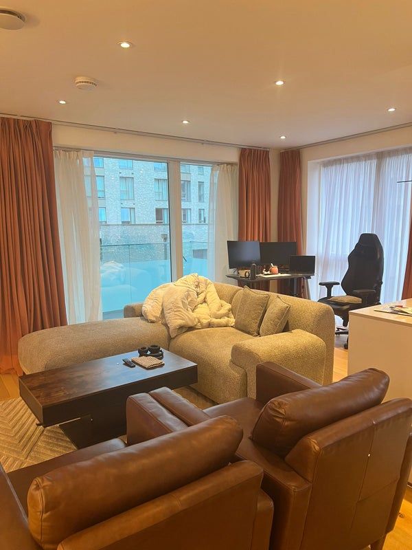 The flat offers a bright open-plan living room with floor-to-ceiling windows and access to a private balcony, an 85 inch TV with access to thousands of series, movies, and tv channels, as well as a smart curtain and blinds set up that can be customised to your preference. The kitchen is fully fitted with integrated appliances including an oven, hob, fridge freezer, dishwasher, toaster, sandwich maker, Nespresso machine, electric kettle, and air fryer. There is also a washing machine in the utility cupboard. The living space includes a sofa, 2 leather accent chairs, and workspace suitable for working from home.