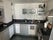 The flat has a fully equipped kitchen with all essential appliances including a dishwasher and washer/dryer, and a cosy living area with a sofa, glass coffee table, and access to a private balcony.