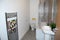 Bathroom - Communal Modern spacious 3-piece suite with a full-size bath, shower over bath, WC, wash basin, and chrome heated towel rail.